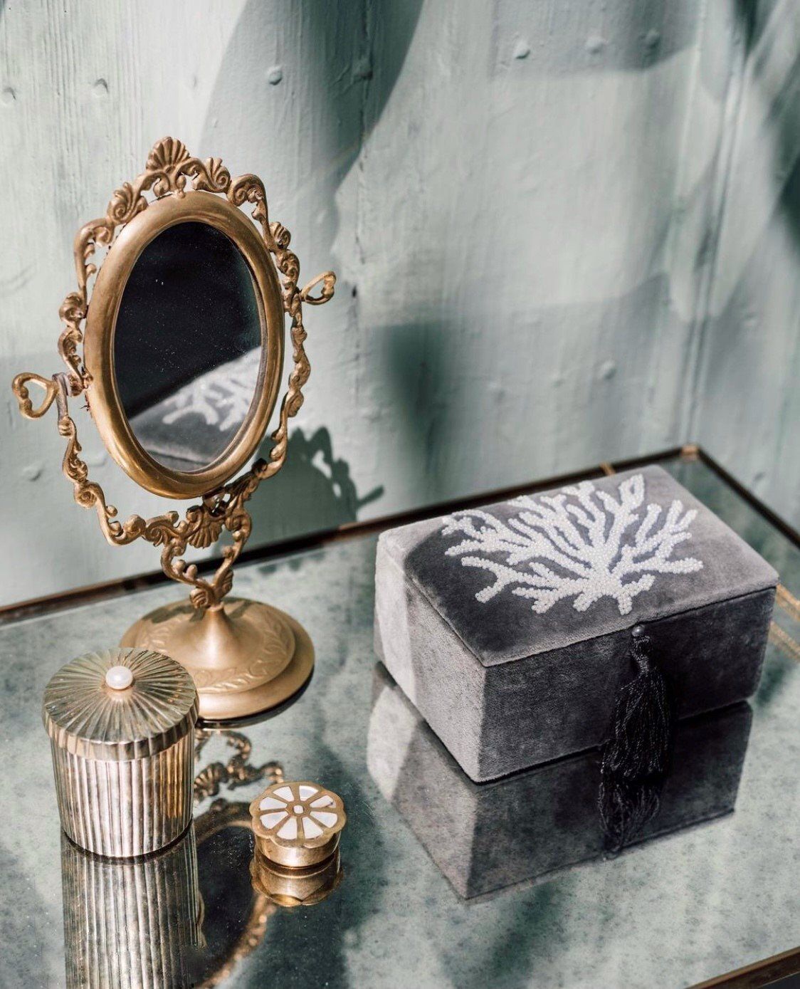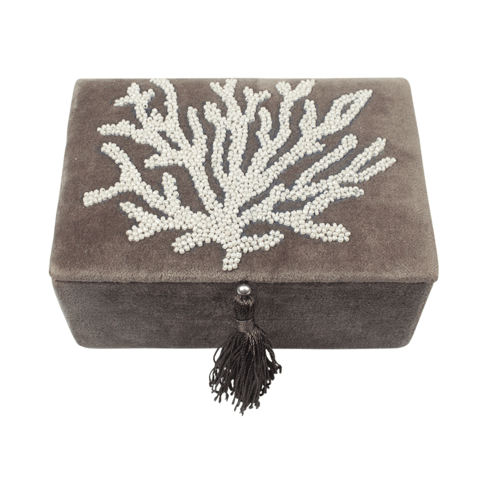 Terug naar de winkelDe velvet shell box is niet zomaar een sieradendoos, maar een prachtige handgemaakte zilvergrijze fluwelen box uit India. Het koraal is gemaakt van parelmoerkleurige kralen en laat de velvet sieradendoos nog meer schitteren. Bewaar hier je mooiste sieraden in of gebruik hem om iets anders op te bergen.